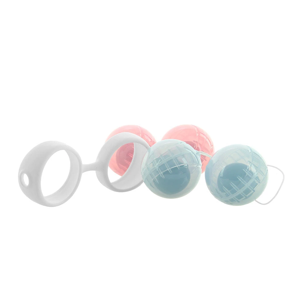 Inside the box, you’ll find five pieces that can be mixed-and-matched or used alone, all depending on your preference and experience level. A silky white cradle comes pre-fitted with a pair of 1oz/28g pink beads. Two identically sized 1.3oz/37g beads will be waiting right beside the assembled set. All 4 beads feature a very special rolling weight inside that jiggles and rocks with movement. If you’re a kegel beginner, you can try wearing a single bead in the cradle or all on it’s own, but if you do decide to so solo, pick one with a retrieval cord for your comfort. Slip both pink beads, both blue or a combination of blue and pink into the cradle to experiment with different weights and sensations.