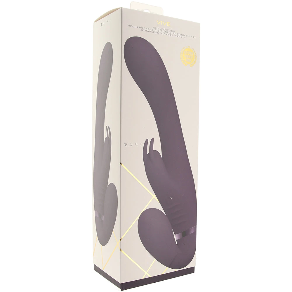 True story: strap-on sex is amazing. Whether you’re pleasing a partner, being pleased by your partner, pegging or otherwise, having total control over their stimulation is super sexy. If there’s one downside to strap-on sex, though, it’s the actual straps! To instantly eliminate any and all tangle potential, turn to Vive’s Suki Triple Action Strapless Strap On Rabbit Vibe.