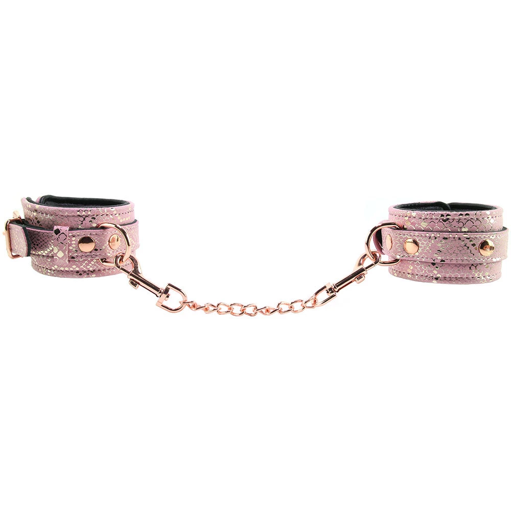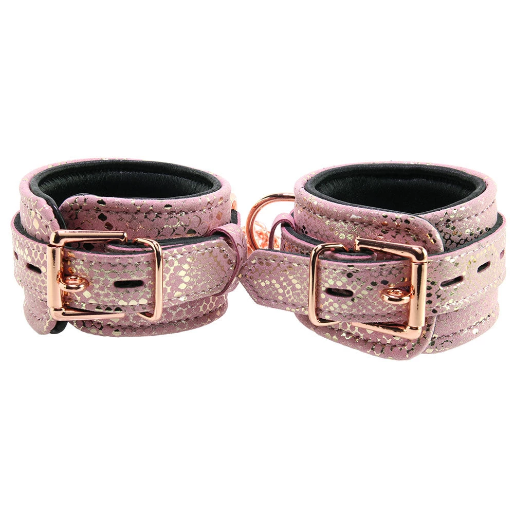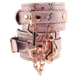 With gorgeous gold flecked pink microfiber on one side and padded black leather on the other, the Cuffs hold nice and tight over your or your partner’s wrists. The leather provides a natural padding effect, plus, it conforms gently to the skin as it takes on body heat. Wrap the inner bands over the wrists in question before tightening up the outer buckle band. The buckles can be locked, in case of an extremely disobedient sub (lock not included).